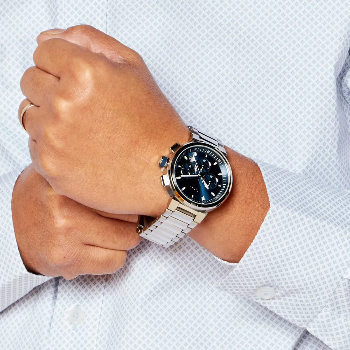 La Hugo Boss 1513999 se distingue par son équilibre parfait entre style professionnel et esprit sportif. Son cadran bleu texturé accueille trois compteurs chronographe ainsi qu’un guichet date à 4h, le tout souligné par des index argentés épurés. Le boîtier en acier inoxydable et le bracelet assorti apportent robustesse et élégance au quotidien. Une montre conçue pour l’homme moderne, entre performance et sophistication.