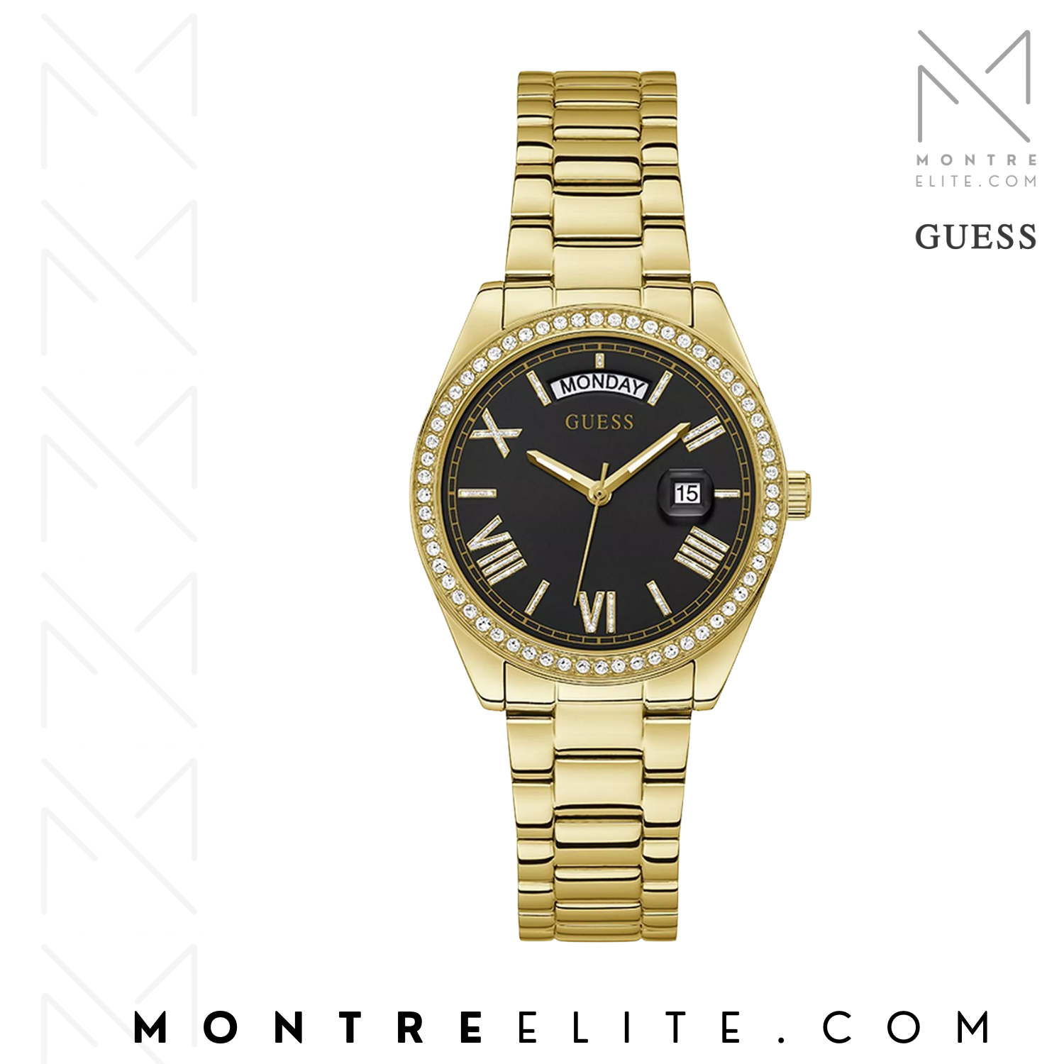 La Montre femme Guess Luna GW0307L2, proposée par Montre Elite, associe un bracelet doré brillant à un cadran noir avec chiffres romains pour un look raffiné et sophistiqué. Sa lunette ornée de cristaux et son affichage du jour et de la date apportent une touche glamour très tendance, parfaite pour sublimer vos tenues de tous les jours comme vos looks de soirée. Un excellent choix pour les femmes qui recherchent une montre de marque élégante, lumineuse et pleine de caractère. Disponible chez Montre Elite avec livraison rapide partout au Maroc.