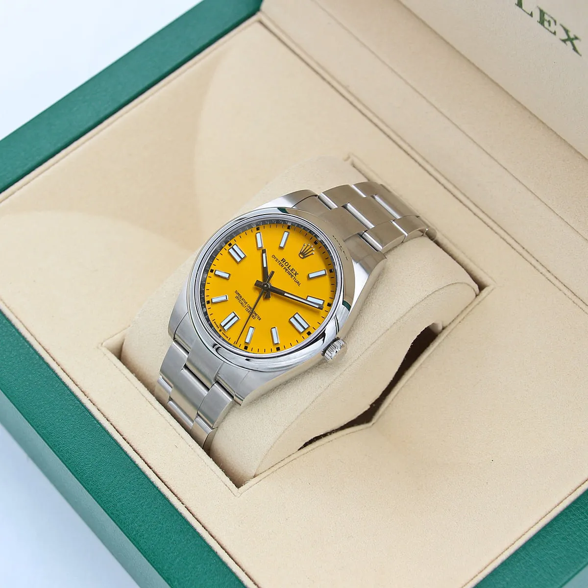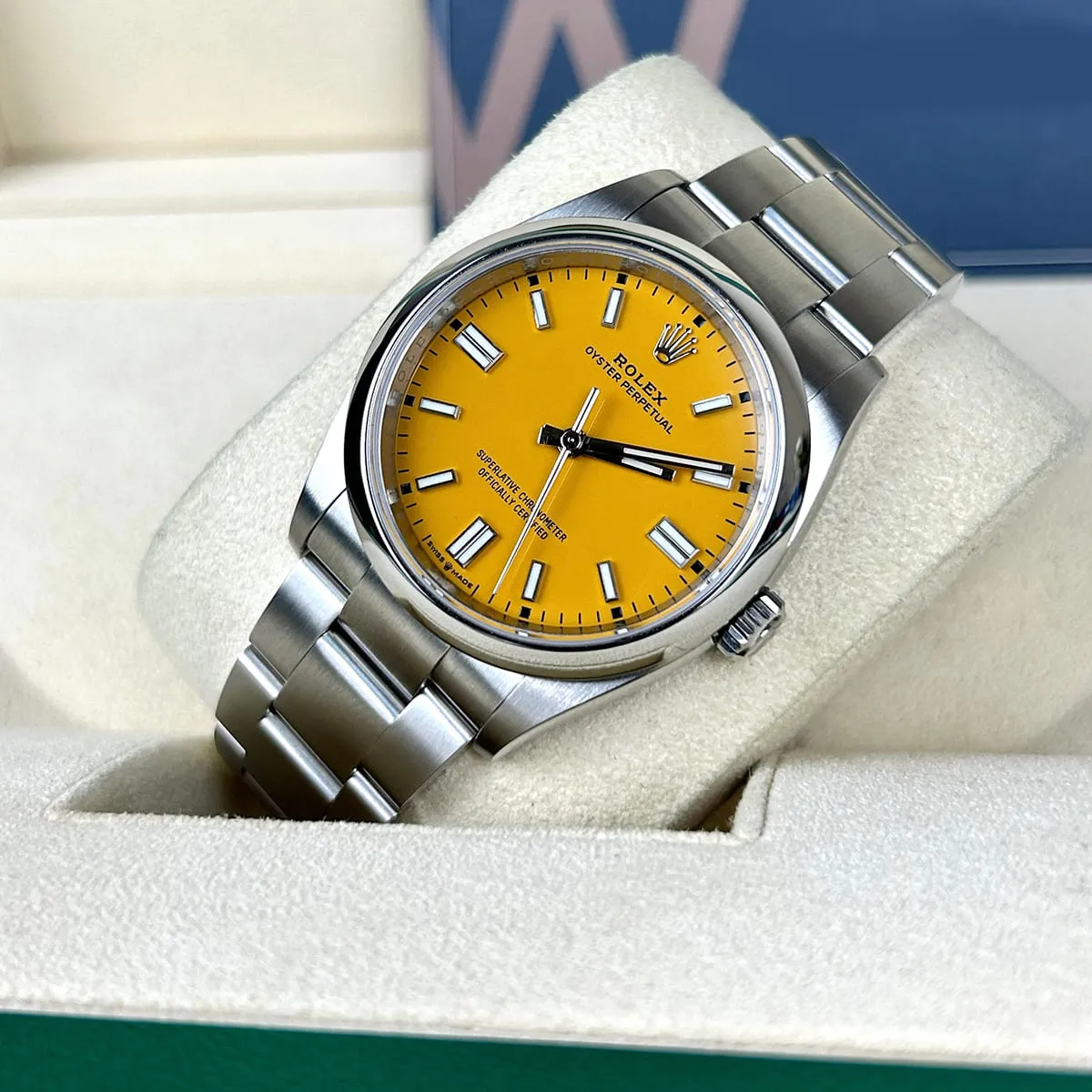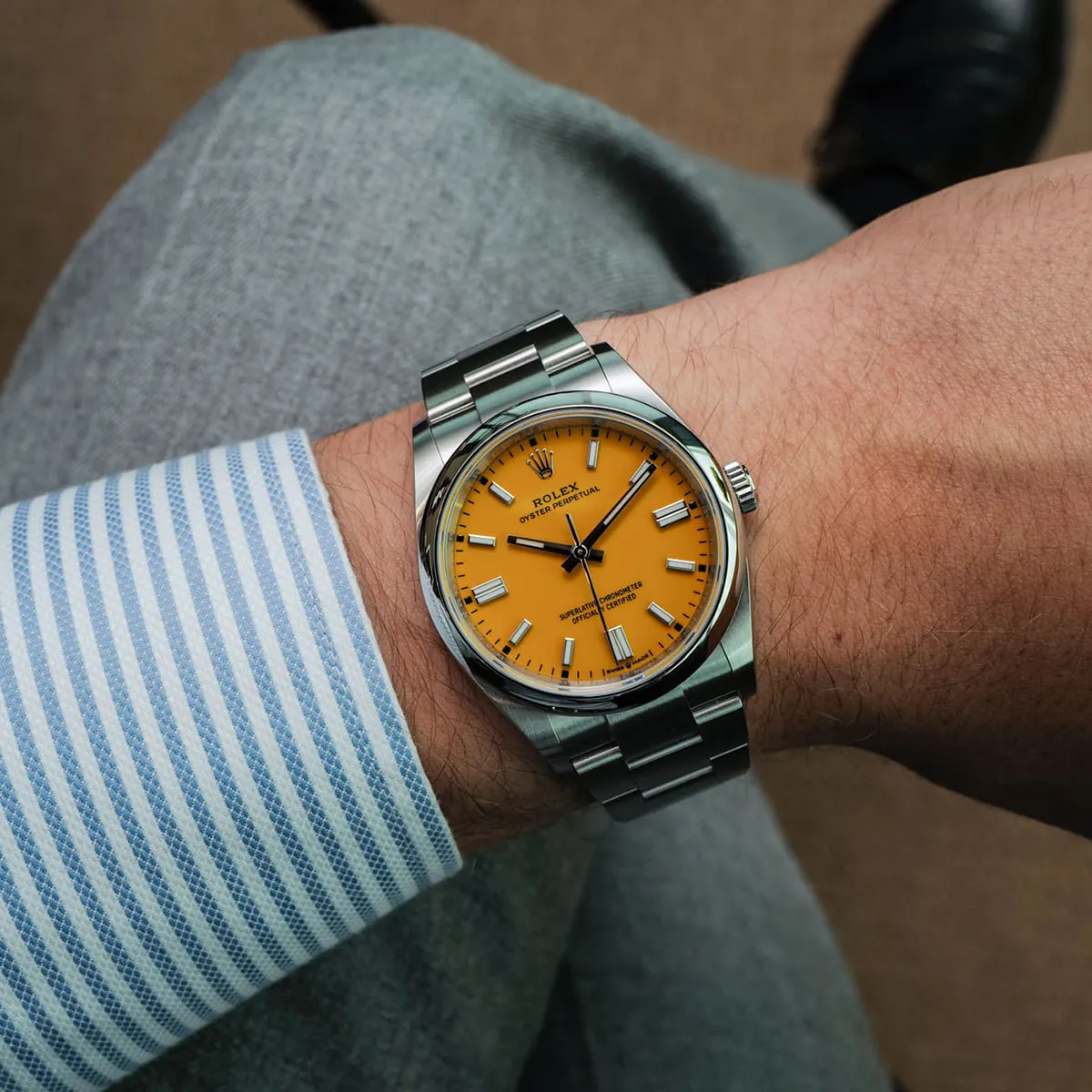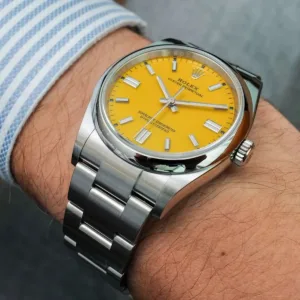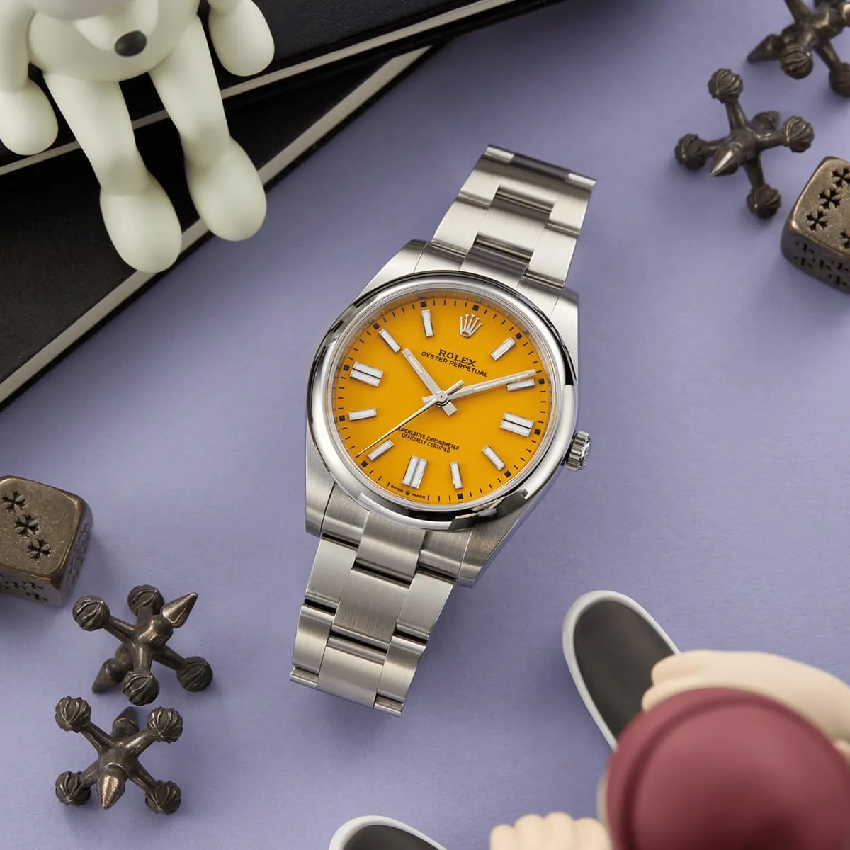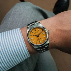 Sorti pour la première fois en 1931, l’Oyster Perpetual est une montre Rolex dans sa forme la plus pure. Il s’agissait de la première montre-bracelet étanche à remontage automatique à utiliser le système de rotor breveté qui a été le modèle de presque toutes les montres ultérieures du catalogue Rolex. C’est pourquoi vous remarquerez les mots OYSTER PERPETUAL sur le cadran de la plupart des montres d’aujourd’hui. Voilà ce que nous appellerions un héritage ! Si l’Oyster Perpetual vous semble familier, c’est parce qu’il le devrait. La combinaison de la conception étanche du boîtier Oyster et d’un mouvement à remontage automatique a conduit à un boîtier de montre si parfait et polyvalent que Rolex a décidé de l’utiliser comme base de la majorité de ses futurs modèles. Le Submariner, le GMT Master, le Milgauss et l’Explorer partagent tous l’ADN de l’Oyster Perpetual, ajoutant des fonctionnalités ou des modifications si nécessaire pour répondre à l’utilisation prévue. L’évolution, pas la révolution, c’est la voie Rolex. Malgré les autres modèles qu’elle a inspirés, l’Oyster Perpetual est restée en production et offre aux amateurs de montres une expérience de propriété Rolex simplifiée et élégante. Disponible en trois tailles et plusieurs options de couleur de cadran, l’OP, comme on l’appelle parmi les fans de Rolex, offre une excellente entrée dans la marque et peut également être un ajout minimaliste pour un collectionneur chevronné.