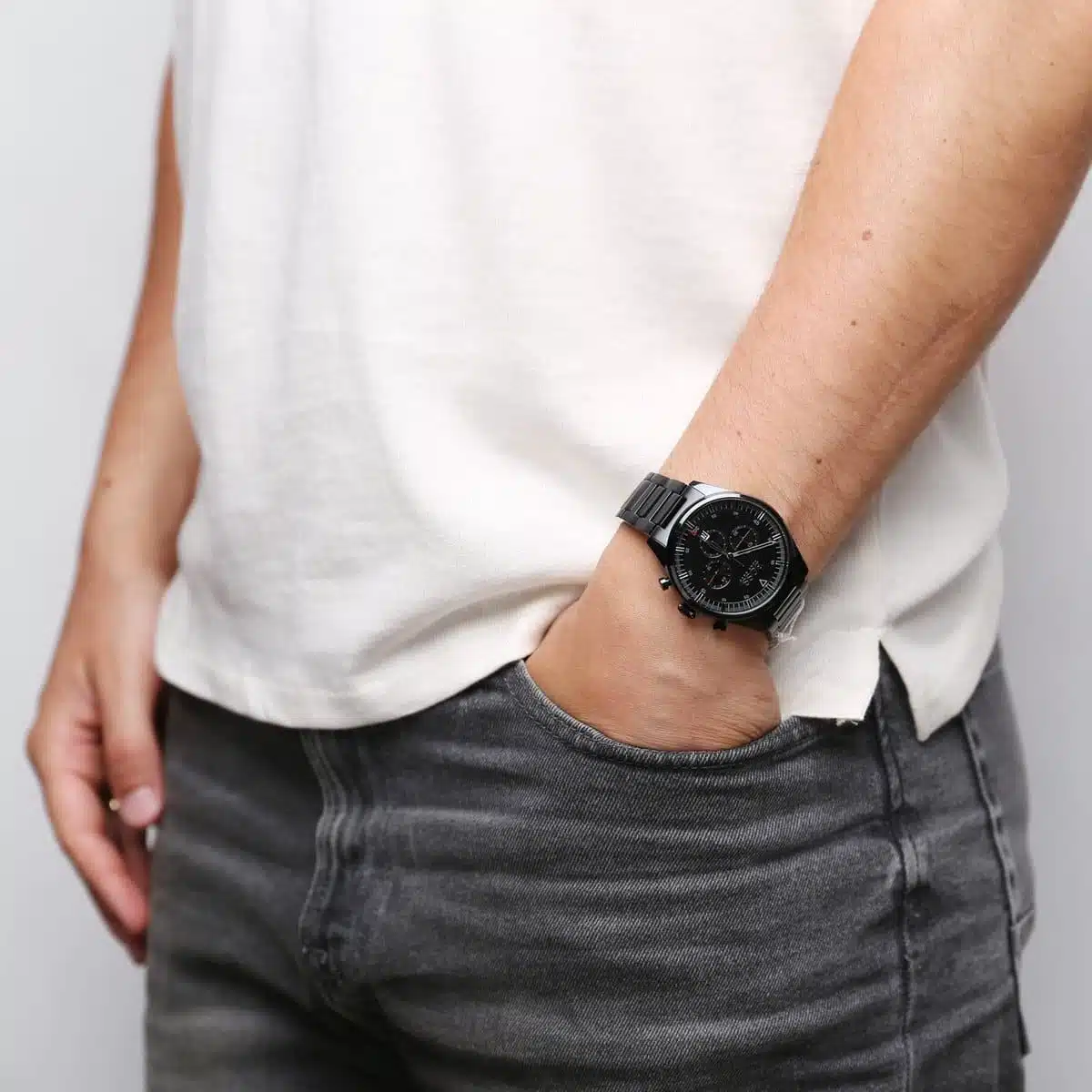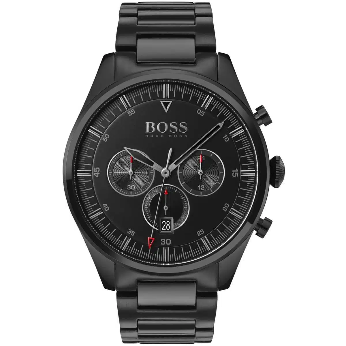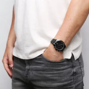 La Hugo Boss 1513714 impose sa prestance avec son boîtier et bracelet entièrement noirs qui créent un look monochrome saisissant et contemporain. Son cadran noir profond aux chiffres romains et ses sous-compteurs chronographe aux détails rouges révèlent une sophistication technique remarquable. Une montre de caractère qui incarne la puissance masculine et l’audace stylistique avec une présence magnétique indéniable.