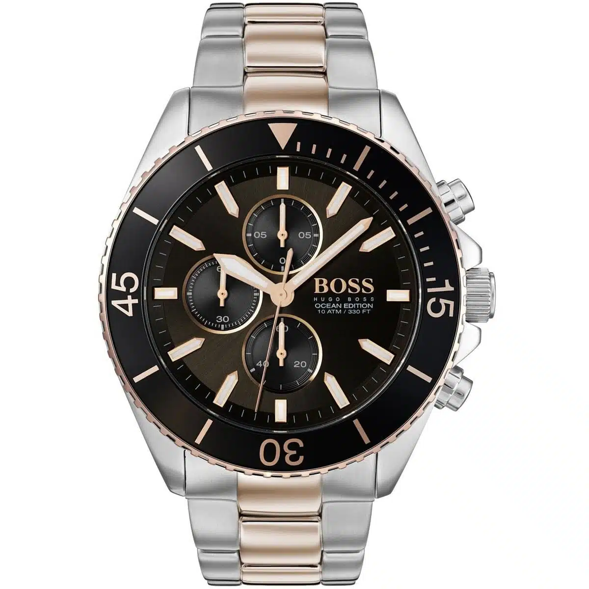 La Hugo Boss Ocean 1513705 incarne la force et l’élégance dans un design inspiré du monde marin. Son imposant boîtier en acier bicolore argent et doré accueille un cadran noir intense avec affichage chronographe et date, entouré d’une lunette rotative noire au style sportif affirmé. Le bracelet en acier inoxydable bicolore accentue l’allure masculine et sophistiquée de ce modèle conçu pour affronter tous les horizons, avec une étanchéité jusqu’à 10 ATM.