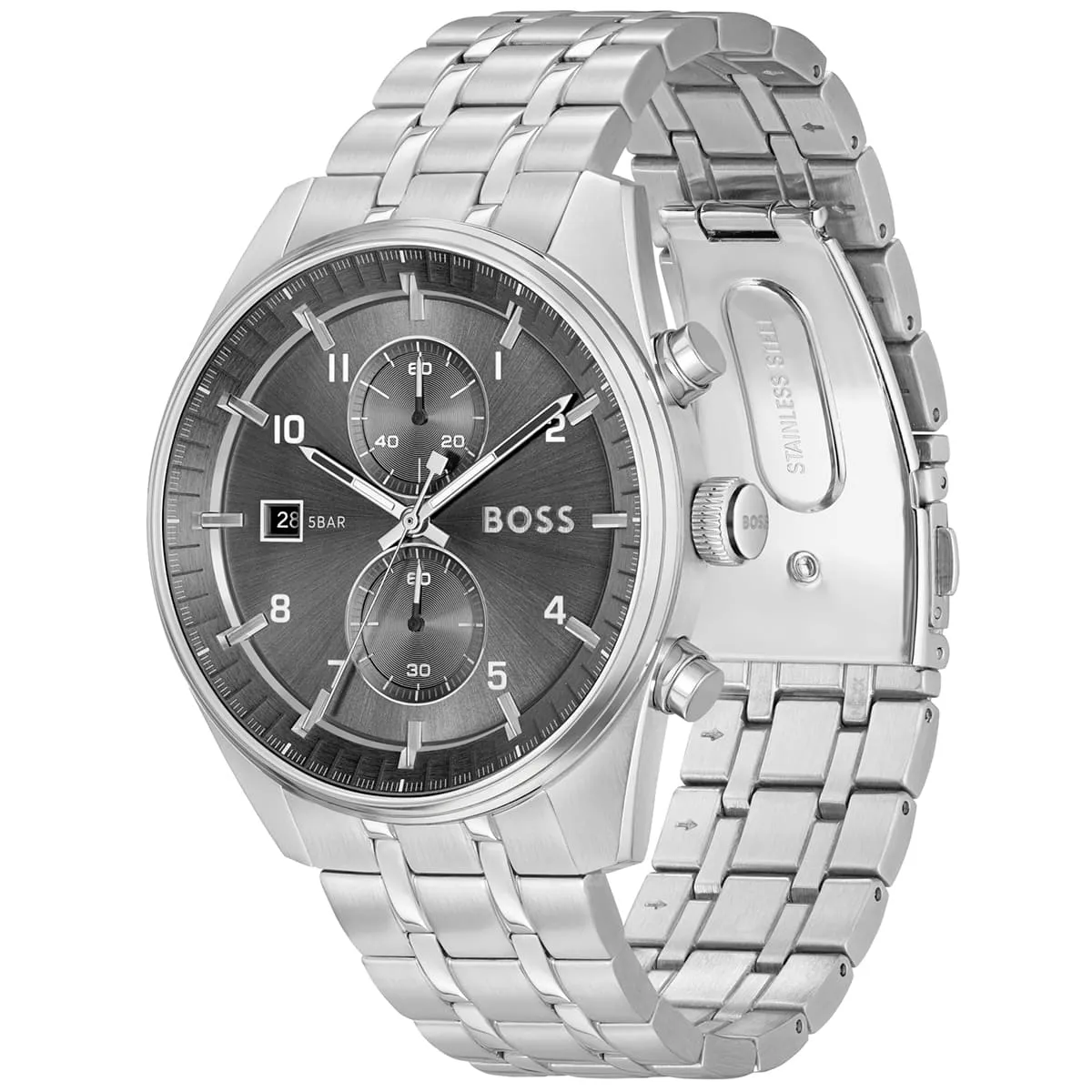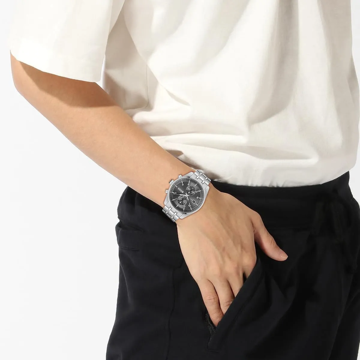 La Hugo Boss Skytraveller 1514151 impose sa prestance avec son cadran anthracite profond et ses sous-compteurs chronographe parfaitement équilibrés. Son boîtier en acier poli et son bracelet à maillons sculptés révèlent un savoir-faire horloger d’exception, tandis que ses détails lumineux garantissent une lisibilité parfaite. Une montre de caractère qui incarne l’élégance masculine moderne et la précision technique absolue.